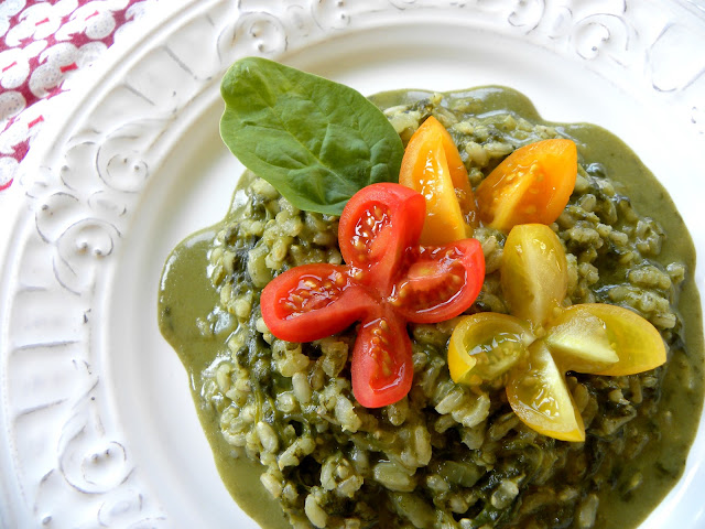 I love when something improvised goes so well. Today I´ve planned to make a fresh summer salad for lunch, but before getting into the kitchen, I have changed my mind and I´ve decided I wanted rice. So instead of an spinach salad, I´ve prepared a risotto with those spinach and a specialty cheese ("tetilla cheese") i brought from Galicia. It seemed I had everything against me, because I had no risotto rice nor broth, but a craving is a craving and I used brown rice. Call me crazy, but yes, I made risotto with brown rice and it was deathly good! Otherwise, I had not shared the recipe...